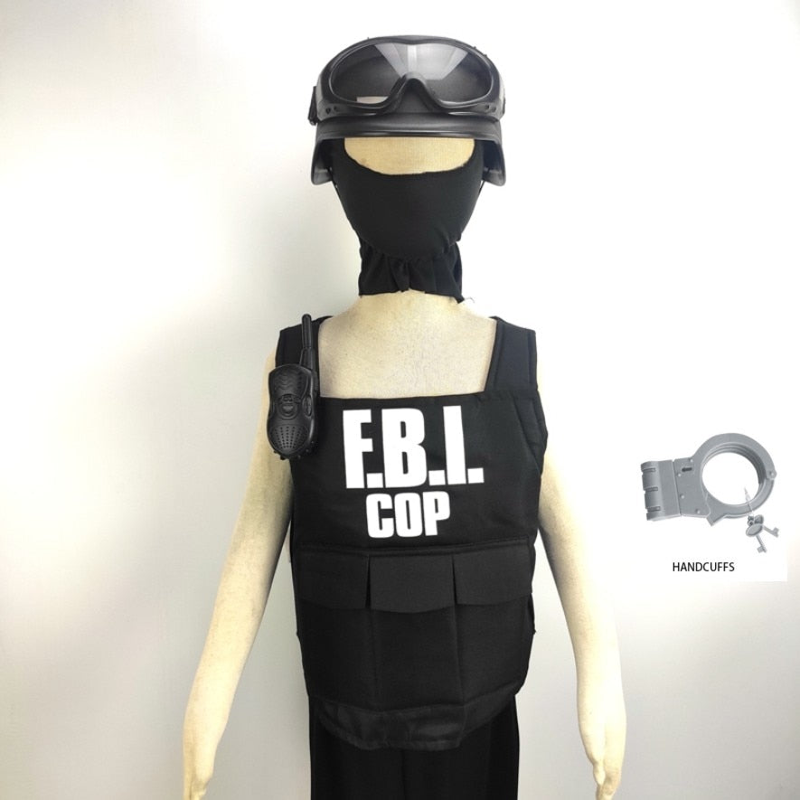 For children aged 3-9years, this machine washable role-playing set contains everything, just like a real FBI bulletproof. The thickness of the costume is more than 1.5CM。